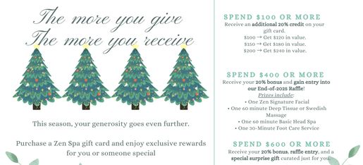 When you spend $400 or more, you’ll still get the 20% bonus plus automatic entry into our End-of-2025 Raffle (with prizes like a Zen Signature Facial, a 60-minute massage, a 60-minute Basic Head Spa, or a 30-minute Foot Care service).
